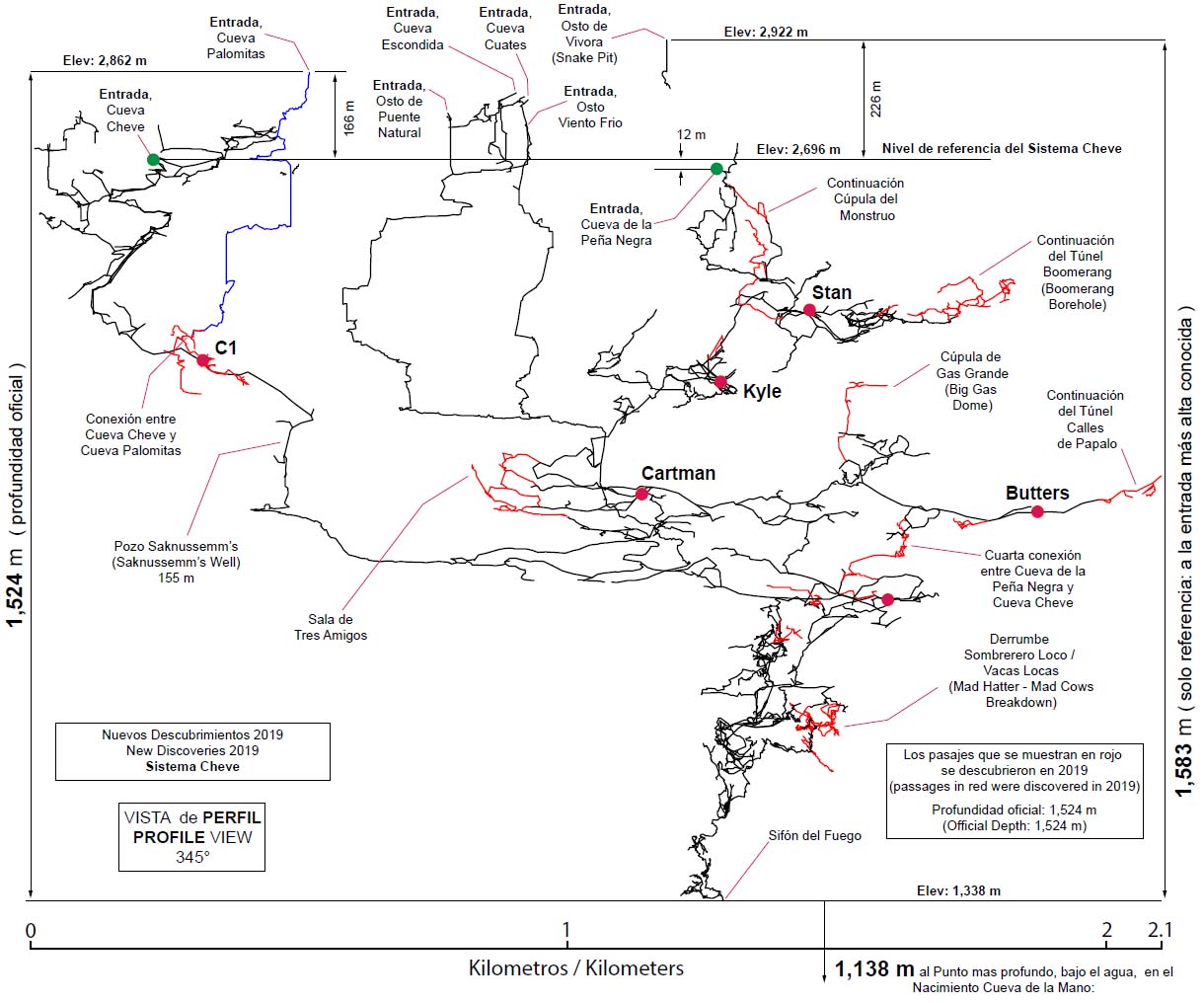 The past three years have seen Cueva Cheve more than double in length (to 55 kilometers) and increase in depth to 1,524m. Most of the additional length came from the Cueva de la Peña Negra, which was discovered in 2017 and connected to Cheve in 2018. In 2019 several more kilometers were added in the Peña Negra, but without major breakthroughs. Nonetheless, there remain many promising leads and new location data on Snake Pit, the highest known entrance in the Cheve karst, show that it is directly above the "60 m Pit" in Peña Negra. A connection with Snake Pit would place the current surveyed system at close to 1,600 meters deep, so there is some merit to scaling the waterfall shaft above the 60m Pit while efforts from the surface continue to push Snake Pit downwards. Significant leads in Peña Negra include continued exploration of Big Gas dome (accessible from Camp Butters); the Shadow Tower Borehole (from Camp Kyle); and a careful investigation of the east wall of the main tunnel between Camps Kyle and Cartman, among others.