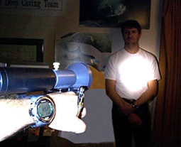 The new light is extremely white and forms a tightly focused beam;it illuminates about a 60 cm (2 foot) diameter disk on a wall that is 12 m (40 ft) away from the light. This extreme focusing capability, that is far superior to any existing cave diving light, is due to the near point-source nature of the lamp element. The run time on the standard AUL battery pack is over 5 hours with the increased efficiency lamps. Thus, one light may be expected to comfortably exceed the expected bottom time of the longest mission. Each diver will carry 2 of these lights plus traditional lower power back up cave diving lights.
