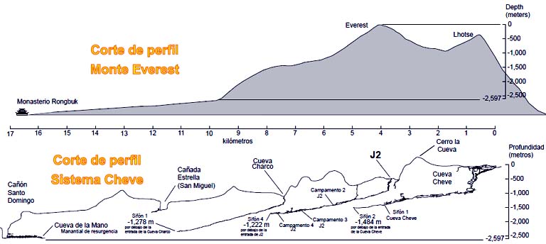 Las cuevas son oscuras. No se pueden ver desde la superficie. Sus entradas muchas veces no muestran la escala de lo que se encuentra en su interior. No hay una manera de comprender la escala de una cueva desde la superficie. De manera inversa, las montañas tienen el efecto opuesto: mientras más cercano a una montaña es mayor su imponencia y escala. No hay lugar que brinde un sentimiento mayor de humildad de mejor manera que el Monte Everest. Desde el Monasterio Rongbuk (a la extrema izquierda en el perfil superior) el Everest es imponente aún a 20 kilómetros de distancia. Al acercarse en la ruta original de Mallory (la arista izquierda en la foto) es claramente aparente el tamaño descomunal de la montaña para cualquier persona que intenta escalarla. El otro mapa en esta página muestra los límites conocidos del Sistema Cheve comparados con un corte transversal del Monte Everest. La extensión horizontal del sistema de cuevas es mucho mayor que la del Everest, que abarcaría desde Lhotse hasta el Monasterio Rongbuk. El equipo de exploración de 2013, de ser exitoso, recorrería una distancia bastante mayor que la distancia del Monasterio Rongbuk a la cumbre del Everest, con un desnivel equiparable con el necesario para llegar a la cumbre desde el glaciar Rongbuk. Al contrario que los montañistas, la parte más pesada comienza al iniciar el regreso a la superficie: la única salida es hacia arriba.